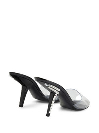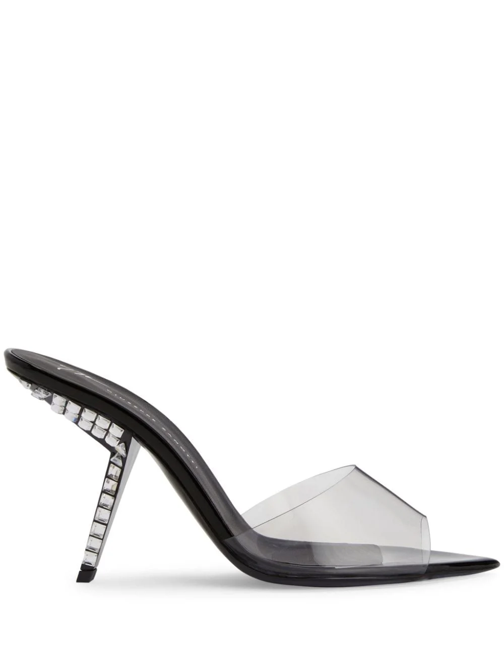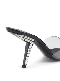 Product Details These pointed-toe mules, crafted from clear PVC, feature black lacquered comma heels embellished with crystal rhinestones and black leather soles. - Clear PVC - 90 mm black lacquered heel with crystal rhinestones - Black leather sole with logo - Made in Italy ORIGIN: ITALY COLOR: BLACK