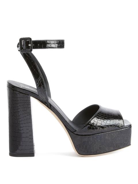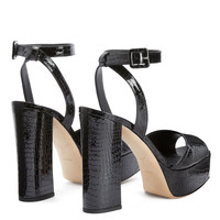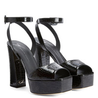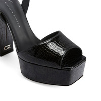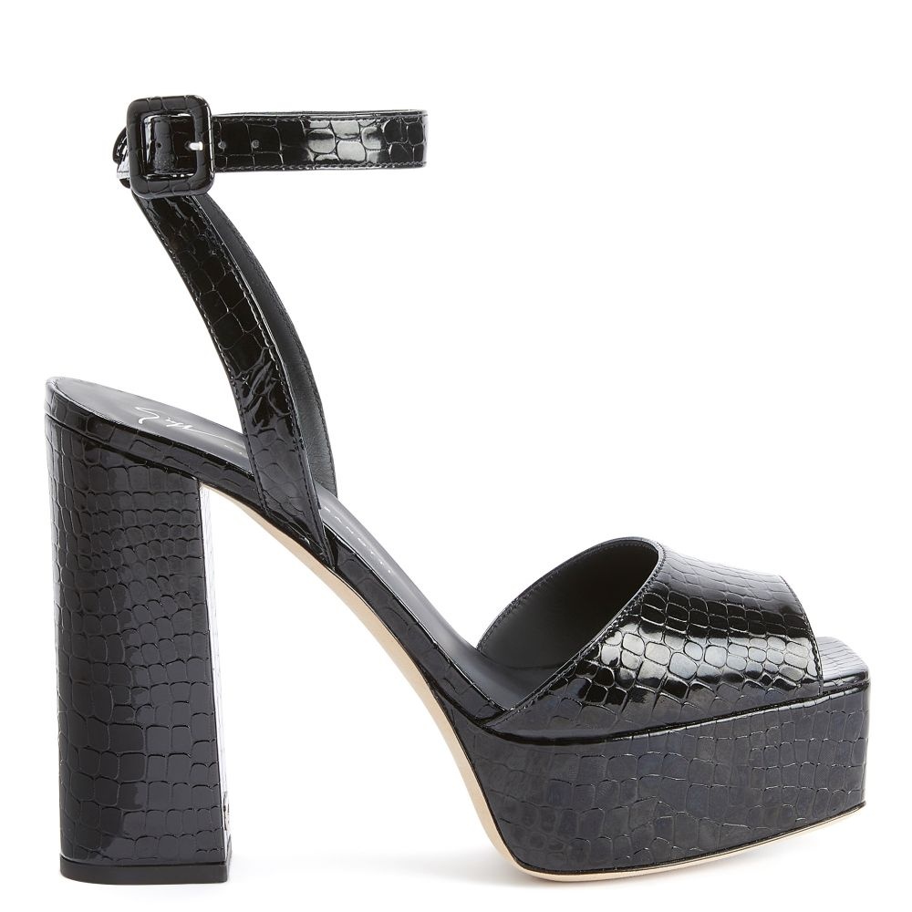 Product Details These open toe sandals, crafted from black laminated synthetic fabric with a crocodile print, feature a square toe, an adjustable ankle strap with matching buckle and matching covered platform and chunky heel, the latter embellished with a 'Signature GZ' detail in silver metal. Laminated black synthetic fabric with crocodile print Adjustable strap with buckle covered in laminated black synthetic fabric with crocodile print and silver metal 'GZ' hardware 120 mm heel covered in laminated black synthetic fabric with crocodile print 40 mm platform covered in laminated black synthetic fabric with crocodile print Leather sole with logo Made in Italy