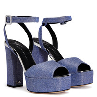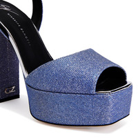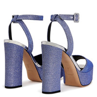 Product Details Open-toe sandals crafted from light-blue laminated synthetic fabric with chunky heels and matching platform; a strap with side buckle covered in silver laminated leather allows an adjustable ankle closure, while a small 'GZ' detail in silver metal applied to the inner heel gives the design a perfect finish. Light-blue laminated synthetic fabric (30% LACE; 30% RECYCLED GLITTER; 10% WATER BASED ADHESIVE; 30% COTTON) Adjustable strap with silver laminated leather buckle 120 mm heel 40 mm platform Leather sole with logo Made in Italy