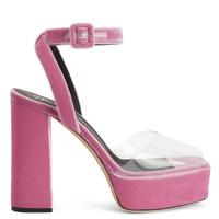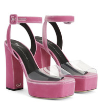 Product Details These open toe sandals, crafted from pink, velvet-effect synthetic fabric, feature a square toe, an adjustable ankle strap with matching buckle, clear PVC front bands and matching covered platform and chunky heel, the latter embellished with a 'Signature GZ' detail in silver metal. Clear PVC (100% PV) and pink, velvety, synthetic fabric (100% PL) Adjustable strap with buckle covered in pink, velvety, synthetic fabric 120 mm heel 40 mm platform Leather sole with logo Made in Italy