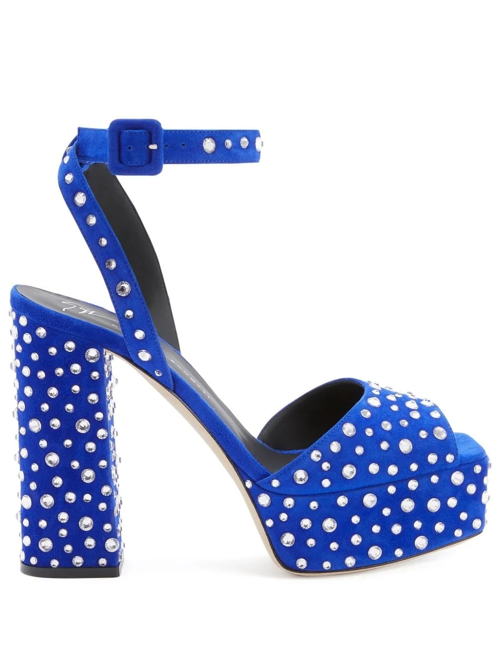 Product Details These open-toe sandals, crafted from cornflower blue suede and embellished with a crystal rhinestones embroidery, feature a square toe, an adjustable ankle strap with matching buckle and matching covered platforms and chunky heels. Cornflower blue suede Adjustable strap with buckle covered in cornflower blue suede Crystal rhinestones embroidery 120 mm heel covered in cornflower blue suede 40 mm platform covered in cornflower blue suede Leather sole with logo Made in Italy