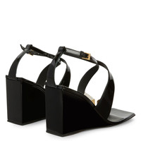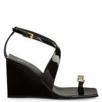 Product Details These thong sandals, crafted from black patent leather, feature matching covered wedges and leather soles, a crossed strap that wraps around the instep up to the ankle where there is an adjustable strap with a small golden metal buckle, and are embellished with golden metal hardware with crystal-coloured rhinestones applied to the thong strap. Black patent leather Golden metal hardware with crystal-coloured rhinestones Golden metal buckle 85 mm wedge Black patent leather covered wedge Black leather sole with logo Made in Italy