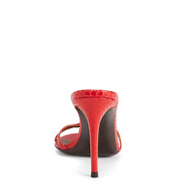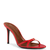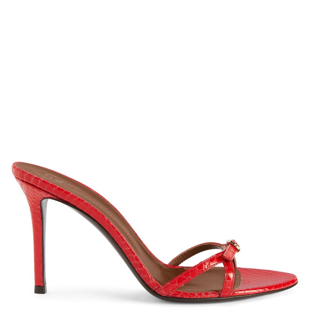 Product Details Open-toe mule sandals in reptile-print leather with metal buckle and stiletto heel. - Red reptile-print leather - Light golden metal buckle - 90 mm-high heel. - Brown leather sole with logo ORIGIN: ITALY COLOR: RED