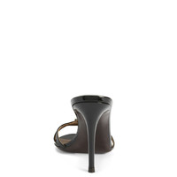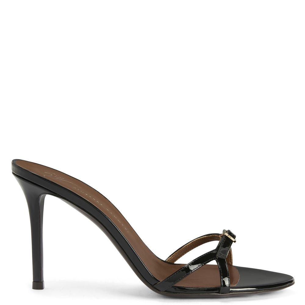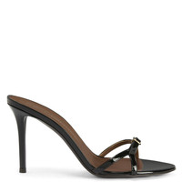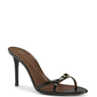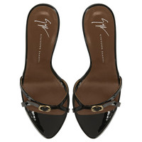 Product Details Open-toe mule sandals in patent leather with metal buckle and stiletto heel. - Black patent leather - Light golden metal buckle - 90 mm-high heel. - Brown leather sole with logo ORIGIN: ITALY COLOR: BLACK
