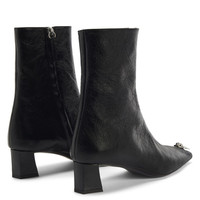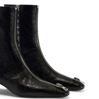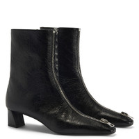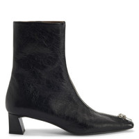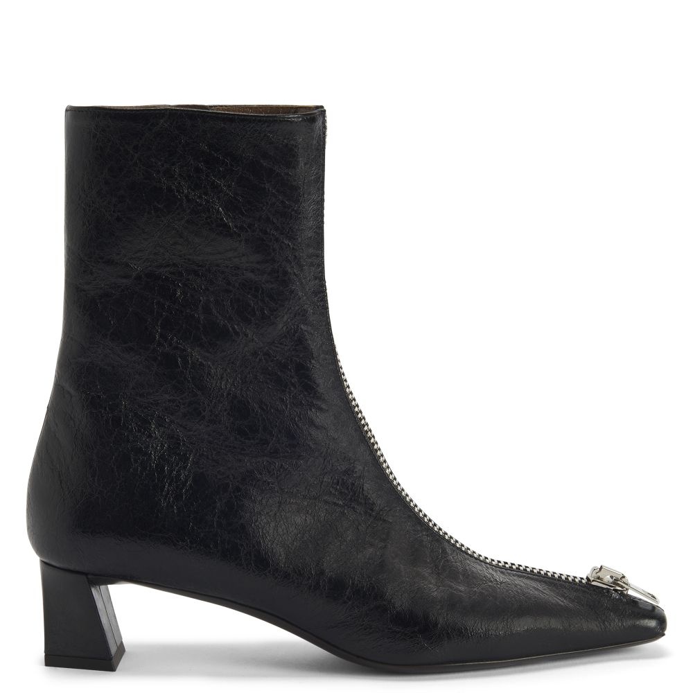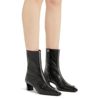 Product Details Leather kitten-heel booties with elongated square toe, large zip accessory on the front and concealed inner zip to help put them on. - Black leather - Silver-coloured metal zip and pull - 45 mm heel covered in black leather - Brown leather sole with logo ORIGIN: ITALY COLOR: BLACK