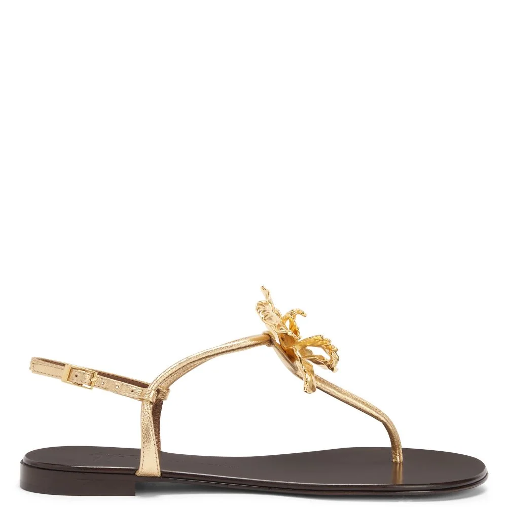 Product Details Flat thong sandals in laminated leather with metal flower detail and leather sole. - Laminated golden leather - Golden metal flower accessory - 10 mm-high heel. - Glossy brown leather sole with logo ORIGIN: ITALY COLOR: GOLD