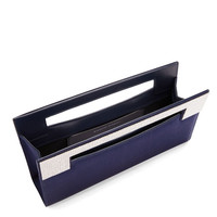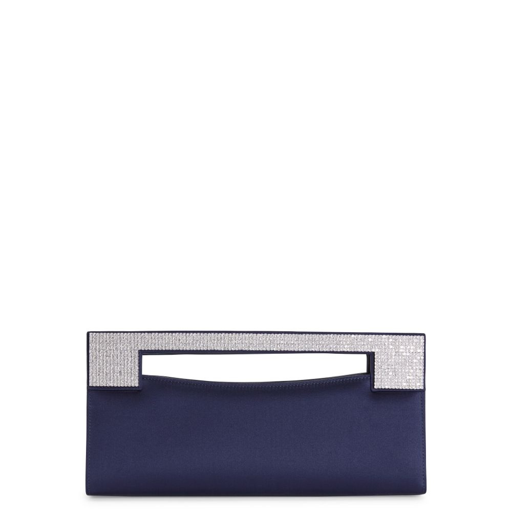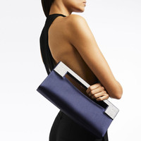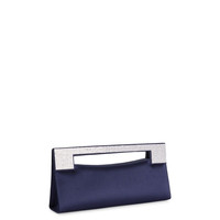 Product Details Rectangular satin clutch with embellished handle and inside pocket. - Black synthetic satin fabric - Silver metal embellishment with crystal rhinestones on the handle - Black fabric lining and black leather pocket - Magnetic fastening - Dimensions: 305 mm x 95 mm x 50 mm ORIGIN: ITALY COLOR: BLACK