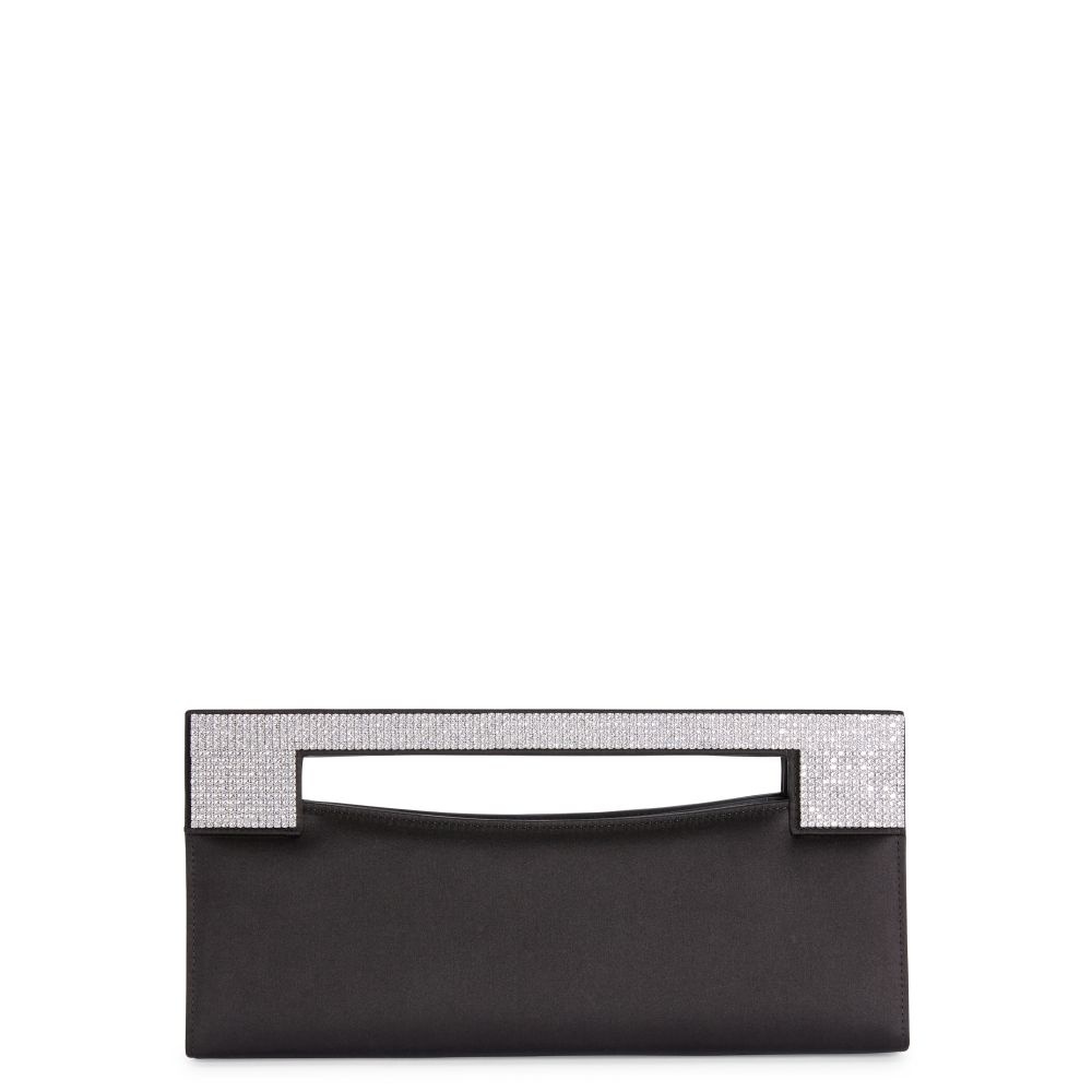 Product Details Rectangular satin clutch with embellished handle and inside pocket. - Brown synthetic satin fabric - Silver metal embellishment with crystal rhinestones on the handle - Black fabric lining and black leather pocket - Magnetic fastening - Dimensions: 305 mm x 95 mm x 50 mm ORIGIN: ITALY COLOR: BLACK
