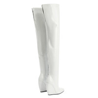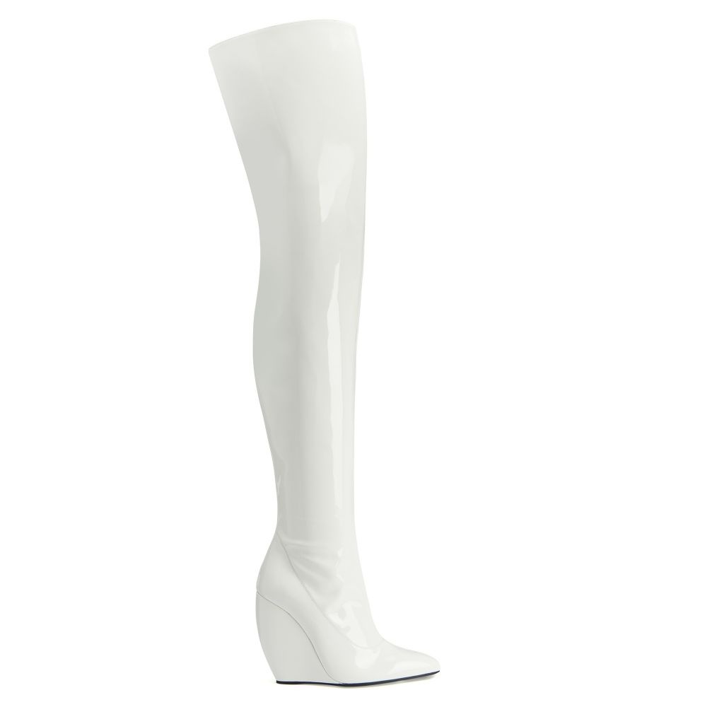 Product Details These pointed-toe thigh-high boots are crafted from white patent-effect synthetic fabric and feature a smooth matching covered curved wedge, a white and silver metal zipper fastening on the inner side and a black leather sole. Patent-effect white synthetic fabric Black and silver metal zipper on the inner side 105 mm wedge Wedge covered in patent-effect white synthetic fabric Black leather sole with logo Made in Italy