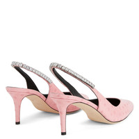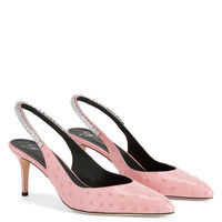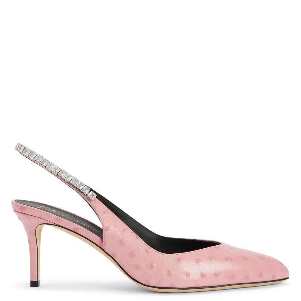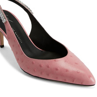 Product Details These pointed toe pumps, crafted from pink leather with an ostrich print, feature matching covered stiletto heels, leather soles with logo and a slingback strap embellished with a silver metal chain with crystal rhinestones. Pink ostrich-print leather Silver metal chain with crystal rhinestones 70 mm heel Ostrich-print pink leather covered heel Leather sole with logo Made in Italy