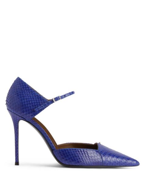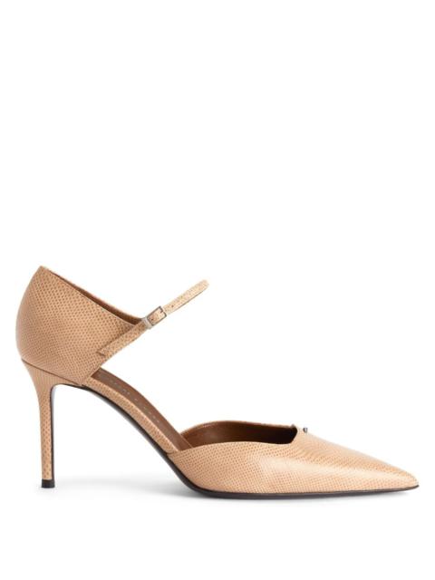 Product Details Tapered-toe pumps in reptile-print leather with square topline, metal stitch detail, crystal-coloured rhinestones and stiletto heel. - Nude reptile-print leather - Silver-coloured metal accessory with crystal-coloured rhinestones - 85 mm-high heel - Brown leather sole with logo ORIGIN: ITALY COLOR: PINK