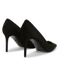 Product Details Suede pumps with a pointed toe, square topline, metallic rhinestone detail, and stiletto heel. - Black suede - Crystal-colored rhinestone detail - 85 mm heel - Heel covered in black suede - Brown leather sole with logo ORIGIN: ITALY COLOR: BLACK