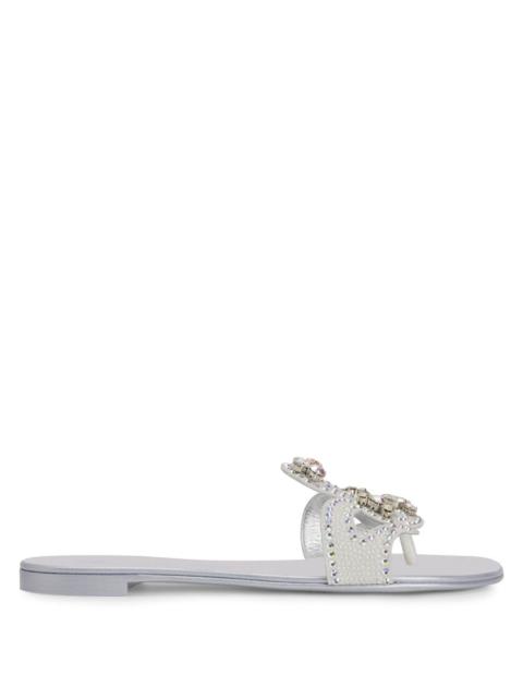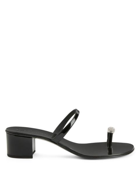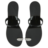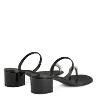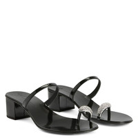 Product Details Thong sandals in patent-effect fabric with rhinestone ring accessory and chunky heel. - Patent-effect black synthetic fabric - Silver metal hardware embellished with crystal rhinestones - 40 mm heel covered in patent-effect black synthetic fabric - Leather sole with logo ORIGIN: ITALY COLOR: BLACK