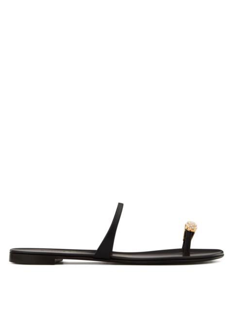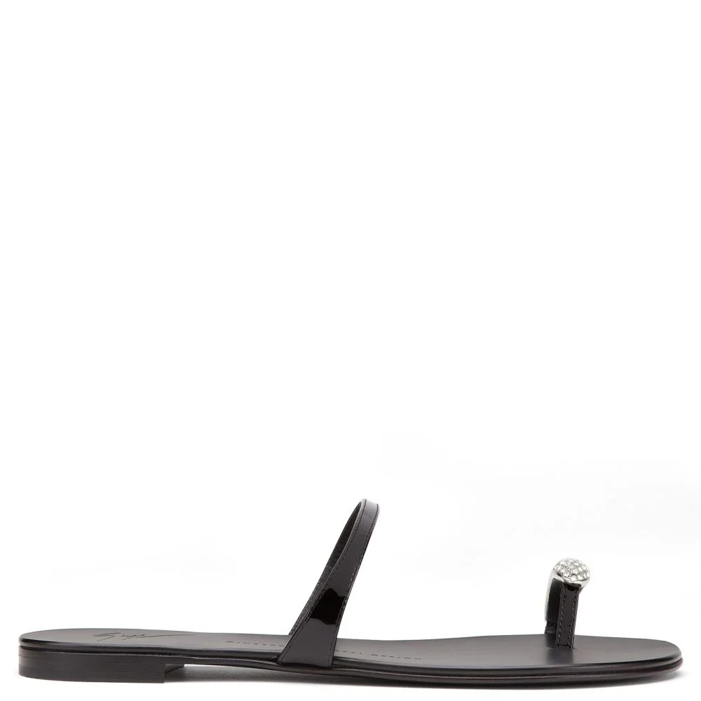 Product Details Patent leather flat sandal - Black patent leather upper - Crystal accessory on toe ring - Leather sole with logo ORIGIN: ITALY COLOR: BLACK