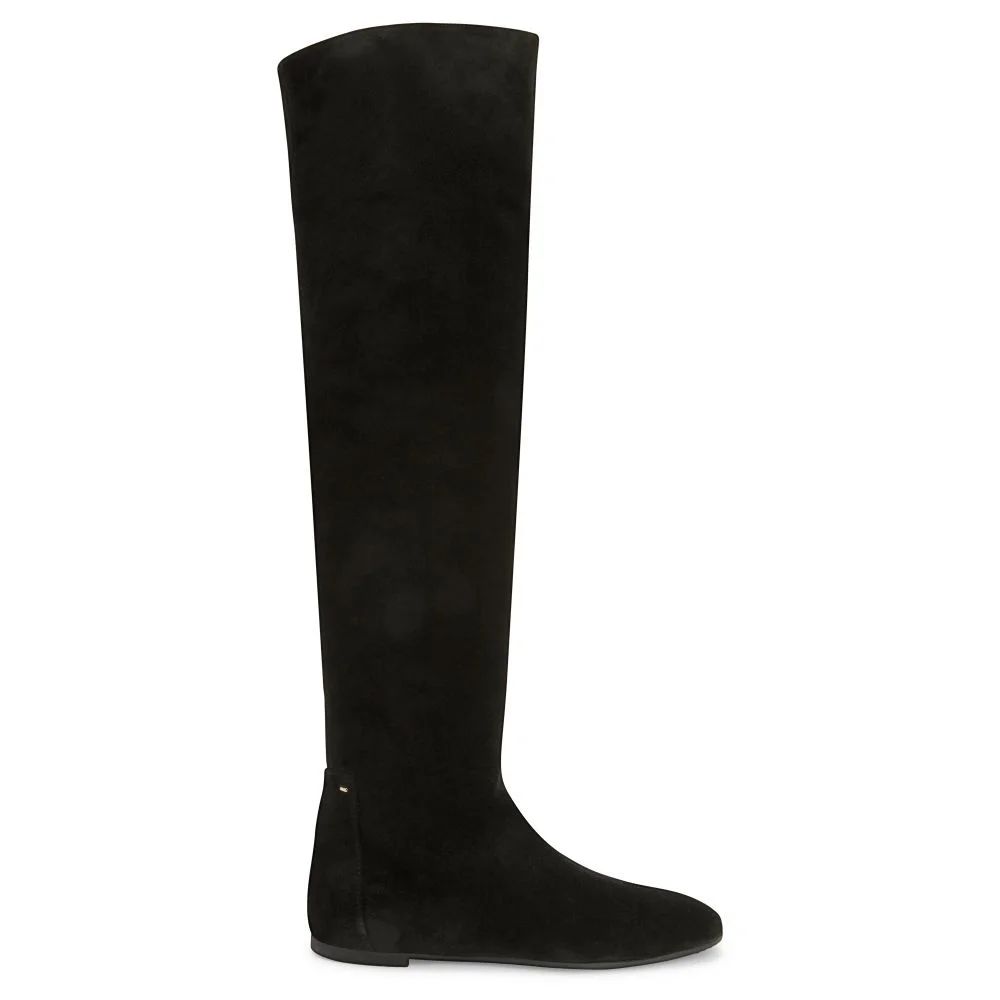 Product Details Flat over-the-knee boots in suede with a metallic detail and rubber sole. - Black suede leather - Light gold metal detail - 05 mm heel - Black rubber sole with logo ORIGIN: ITALY COLOR: BLACK