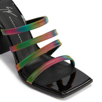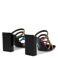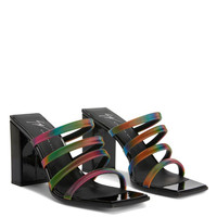 Product Details These mules feature an eye-catching square black leather sole with four multicoloured and laminated synthetic fabric straps and a black rectangular chunky heel. Multicoloured, laminated synthetic fabric (50% TPU; 30% PA; 20% PU) 85 mm heel covered in multicoloured laminated synthetic fabric Leather sole with logo Made in Italy