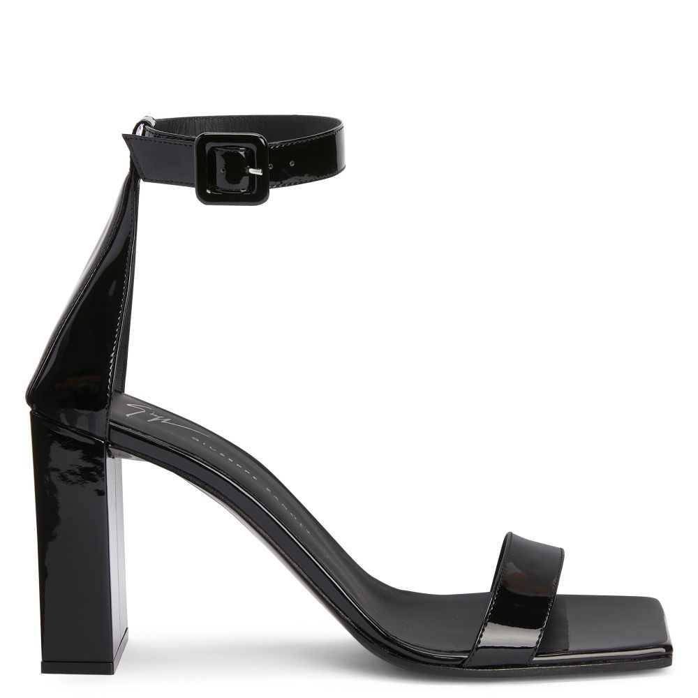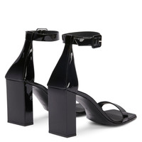 Product Details Sandals crafted from black synthetic fabric with a patent leather effect and matching leather soles, featuring square shapes, adjustable ankle straps with side buckles and matching covered chunky heels. Black patent-effect fabric (34% PL; 66% PU) Adjustable strap with covered buckle 85 mm covered heel Leather sole with logo Made in Italy