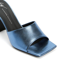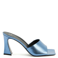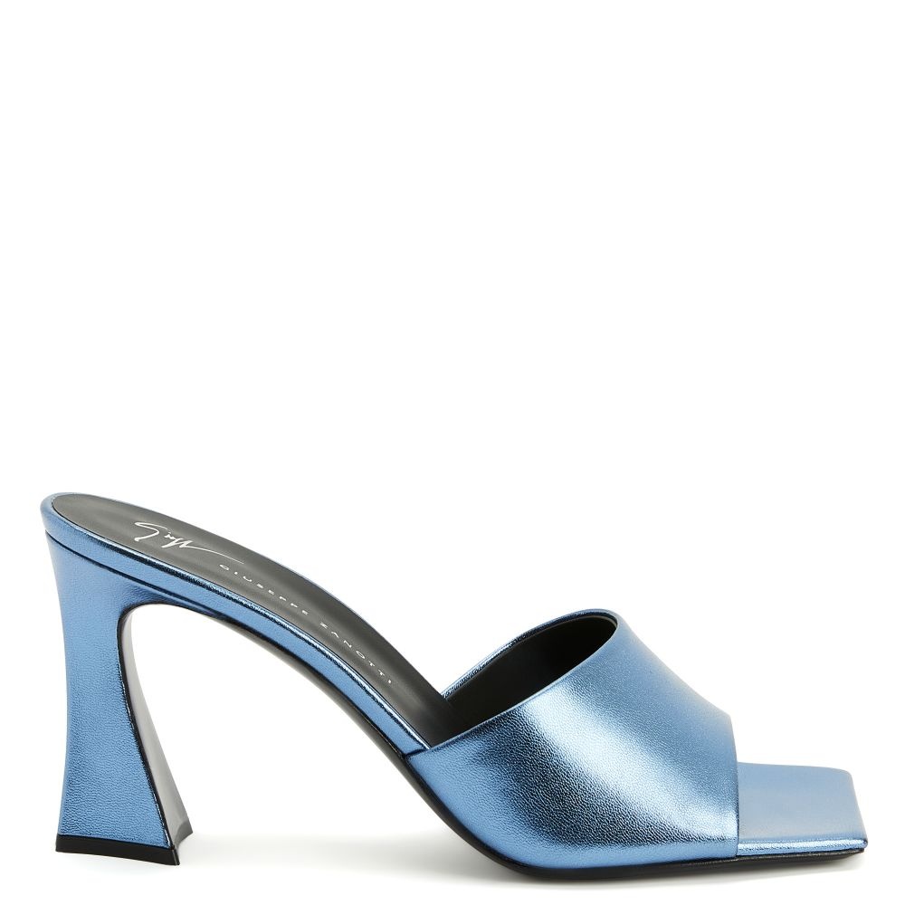 Product Details These mule sandals, made from cobalt blue laminated-effect synthetic fabric, feature a matching covered flared heel, a square toe and a logo-branded leather sole. Cobalt blue laminated-effect synthetic fabric 85mm heel Heel covered in cobalt blue laminated-effect synthetic fabric Leather sole with logo Made in Italy