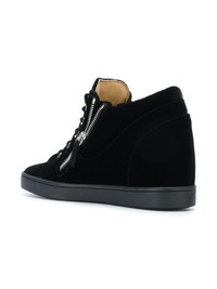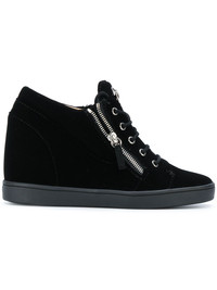 Sonya wedge sneakers Giuseppe Zanotti creates show stopping leather goods for connoisseurs of flawless construction and streetwear edge. These black leather and suede Sonya sneakers from Giuseppe Zanotti are a feminine twist on a sporty aesthetic. The pair feature a round toe, a lace fastening, a brand embossed insole and crystal embellishments. Made in Italy Composition Outer: Cotton 59%, Polyester 41% Lining: Calf Leather 100% Sole: Rubber 100% SIZE & FIT Measurement Sole height 0.98 in(2.5 cm) HEIGHT 2.55 in(6.5 cm) HEEL 3.14 in(8 cm)