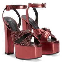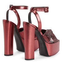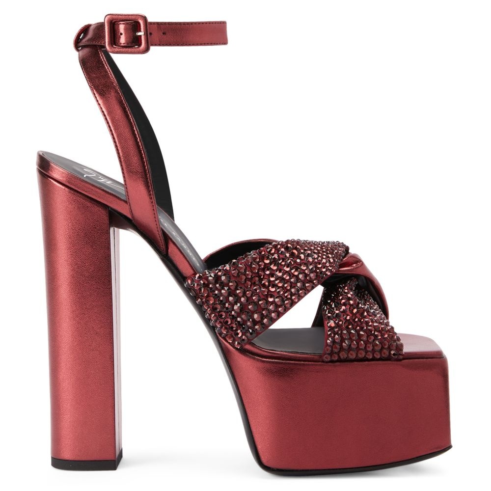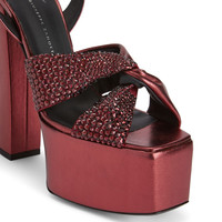 Product Details These sandals are crafted from burgundy leather-effect laminated synthetic fabric and synthetic satin and feature crossed bands embellished with a matching rhinestones embroidery, adjustable ankle straps with a matching buckle and matching covered chunky heel and platform covered in tone. Burgundy leather-effect laminated synthetic fabric and synthetic satin Adjustable strap with leather-effect laminated burgundy synthetic fabric buckle Burgundy rhinestones embroidery 150 mm heel covered in leather-effect laminated burgundy synthetic fabric 70 mm platform covered in leather-effect laminated burgundy synthetic fabric Leather sole with logo Made in Italy