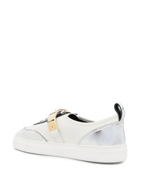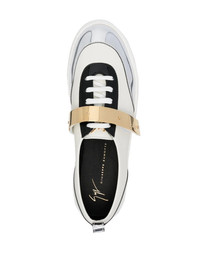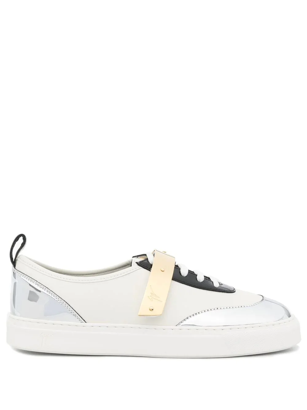 strap-detail low-top sneakers off-white/pale yellow leather gold-tone hardware panelled design round toe front lace-up fastening pull-tab at the heel branded insole flat rubber sole Made In Italy Composition Leather 100%