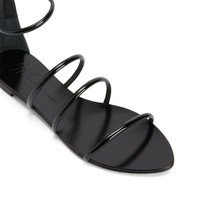 Product Details These flat gladiator sandals, crafted from black patent leather with a rear zip closure and matching pullers, feature a cage design with puffy straps and a matching glossy leather sole. Black patent leather Puffy black patent leather straps and zipper on the back 10 mm heel Glossy leather sole with logo Made in Italy