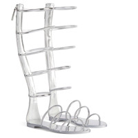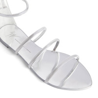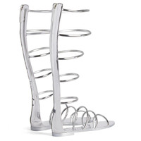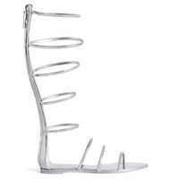 Product Details These flat gladiator sandals, crafted from silver mirror-effect leather with a rear zip closure and matching pullers, feature a cage design with puffy straps and a matching covered leather sole. Silver mirror-effect leather Puffy black patent leather straps and zipper on the back 10 mm heel Glossy black leather sole with logo Made in Italy