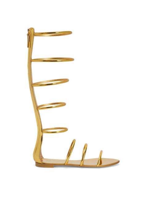 Product Details These flat gladiator sandals, crafted from golden mirror-effect leather with a rear zip closure and matching pullers, feature a cage design with puffy straps and a matching covered leather sole. Gold mirror-effect leather Golden mirror-effect leather puffy straps and zipper on the back 10 mm heel Gold laminated leather sole with logo Made in Italy