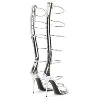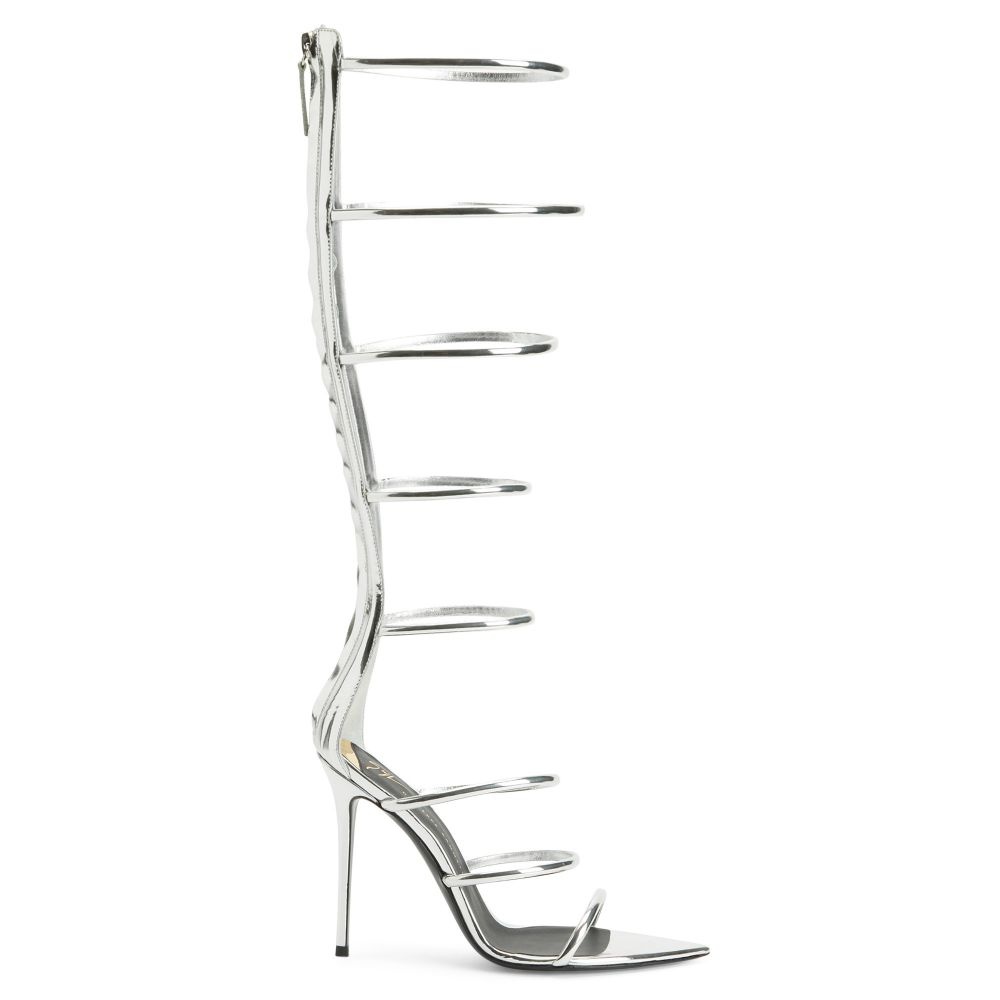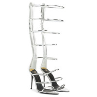 Product Details These knee-high, pointed-toe gladiator sandals, crafted from silver mirror-effect leather with a rear zip closure and matching pullers, feature a cage design with puffy straps, matching covered stiletto heels and a leather sole. Silver mirror-effect leather Silver-effect leather puffy straps and zipper on the back 105 mm heel Heel covered in silver mirror-effect leather Leather sole with logo Made in Italy