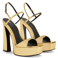 Product Details These open-toe sandals, crafted from mirror-effect golden synthetic fabric, feature matching covered chunky heels and platforms and an adjustable thin ankle strap with a side silver buckle. - Mirror-effect golden synthetic fabric - Mirror-effect golden synthetic fabric strap - Silver metal buckle - 145 mm platform covered in golden mirror-effect synthetic fabric - Black leather sole with logo - Made in Italy ORIGIN: ITALY COLOR: GOLD