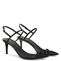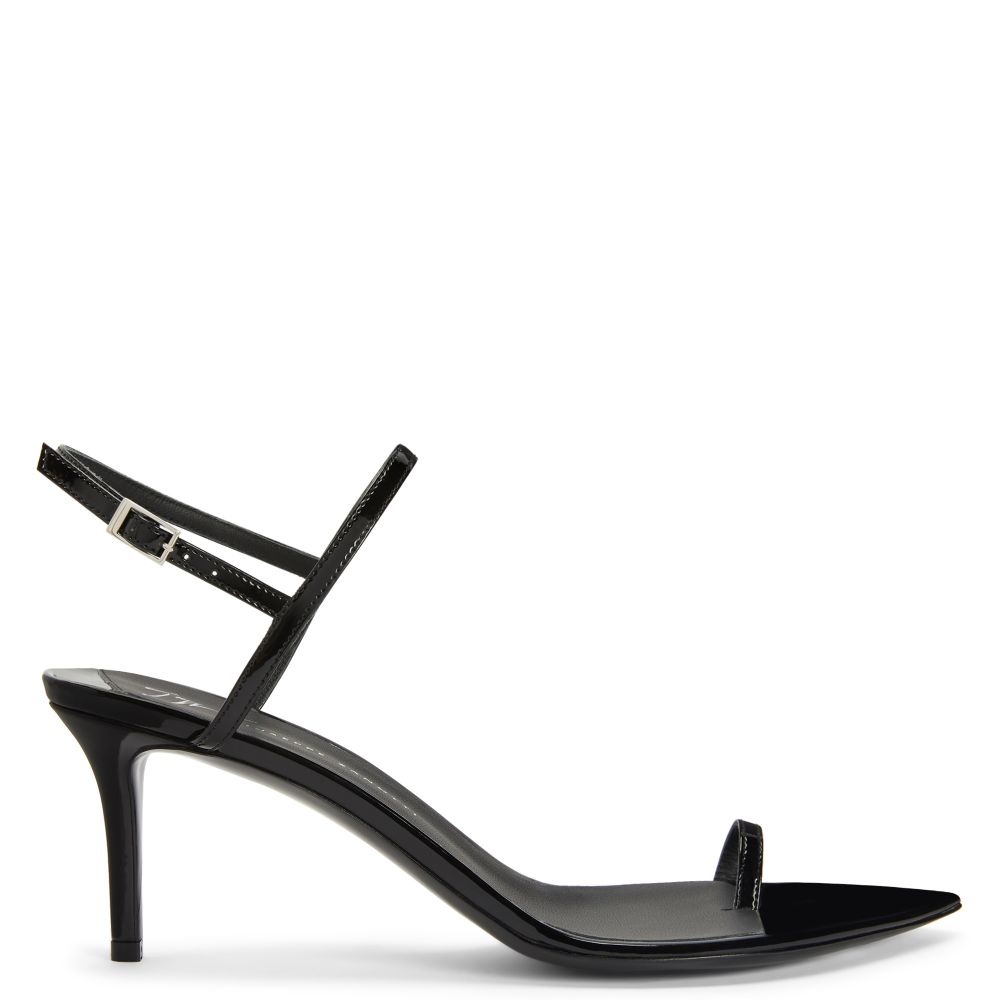 Product Details These pointed-toe thong sandals, crafted from patent-effect black synthetic fabric, feature black leather soles, matching covered stiletto heels and an adjustable ankle strap with a small side silver metal buckle. Patent-effect black synthetic fabric Patent-effect black synthetic fabric adjustable strap with silver metal buckle 70 mm heel covered in patent-effect black synthetic fabric Black leather sole with logo Made in Italy
