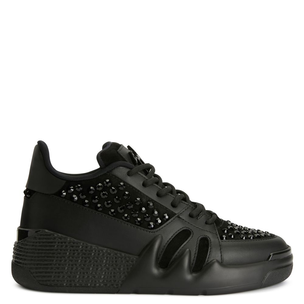 Product Details Mid-top black leather and suede ''Talon'' trainers with tone-on-tone rhinestone embroidery on black suede, black technical fabric lining and lacquered metal Signature detail. The black rubber sole gives this shoe''s design the perfect finish.' Black leather and suede Tone-on-tone rhinestone embroidery Metal Signature Inner wedge: 2.5 cm Rubber sole with logo Made in Italy