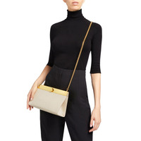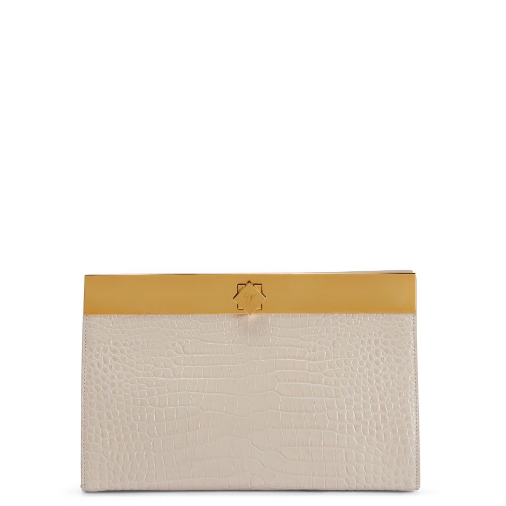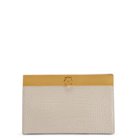 Product Details This clutch bag is crafted from beige leather with an ostrich print and features a golden metal nut-shaped turn lock clasp, a golden metal shoulder strap and a black fabric inner lining with card slots. Beige crocodile-print leather Golden metal nut-shaped turn lock clasp Golden metal chain shoulder strap Black fabric inner lining with card slots Measurements: 255 mm x 160 mm x 90 mm Made in Italy