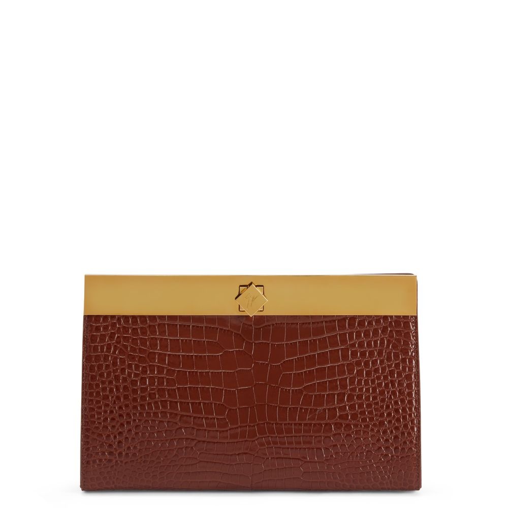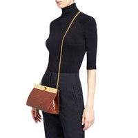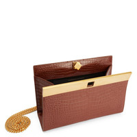 Product Details This clutch bag is crafted from light-brown crocodile-print leather and features a golden metal nut-shaped turn lock clasp, a golden metal shoulder strap and a black fabric inner lining with card slots. Light-brown crocodile-print leather Golden metal nut-shaped turn lock clasp Golden metal chain shoulder strap Black fabric inner lining with card slots Measurements: 255 mm x 160 mm x 90 mm Made in Italy