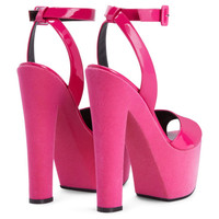 Product Details Peep-toe sandals crafted from neon-pink leather, featuring an adjustable ankle strap with a small upper-matching buckle, and tone-on-tone covered chunky platform and heel. Fuchsia patent leather Adjustable ankle strap with buckle Fuchsia flocked-effect bottom 170 mm heel 65 mm platform Rubber sole with logo Made in Italy