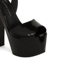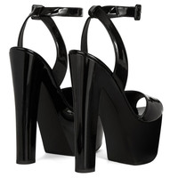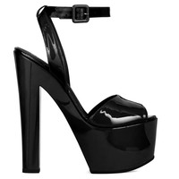 Product Details Sandals in eco-friendly black patent leather, with platform and adjustable ankle strap. Leather sole. 170 mm heel 65 mm platform Eco-friendly black patent leather Leather sole with logo Made in Italy