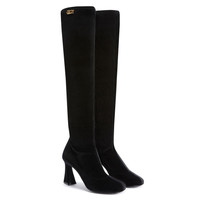 Product Details These black, velvet-effect, stretch synthetic fabric knee-high boots feature a non-slip leather sole and a soft tight shaft; the design is embellished on the outside with the golden metal 'Logozalì' detail and is complete with a black and silver metal inner side zipper and a matching covered spool heel. Velvet-effect black stretch synthetic fabric Golden metal 'Logozalì' detail and black and golden metal zipper on the inner side 85 mm heel Heel covered in suede-effect black stretch synthetic fabric Non-slip rubber and leather sole with logo Made in Italy
