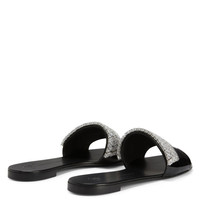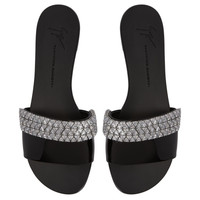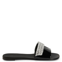 Product Details These slides, crafted from black synthetic fabric with a patent effect, are embellished on the band with a silver metal hardware with crystal rhinestones and feature a matte black leather sole. Patent-effect black synthetic fabric Silver metal hardware with crystal-coloured rhinestones on the band 10 mm heel Matte black leather sole with logo Made in Italy