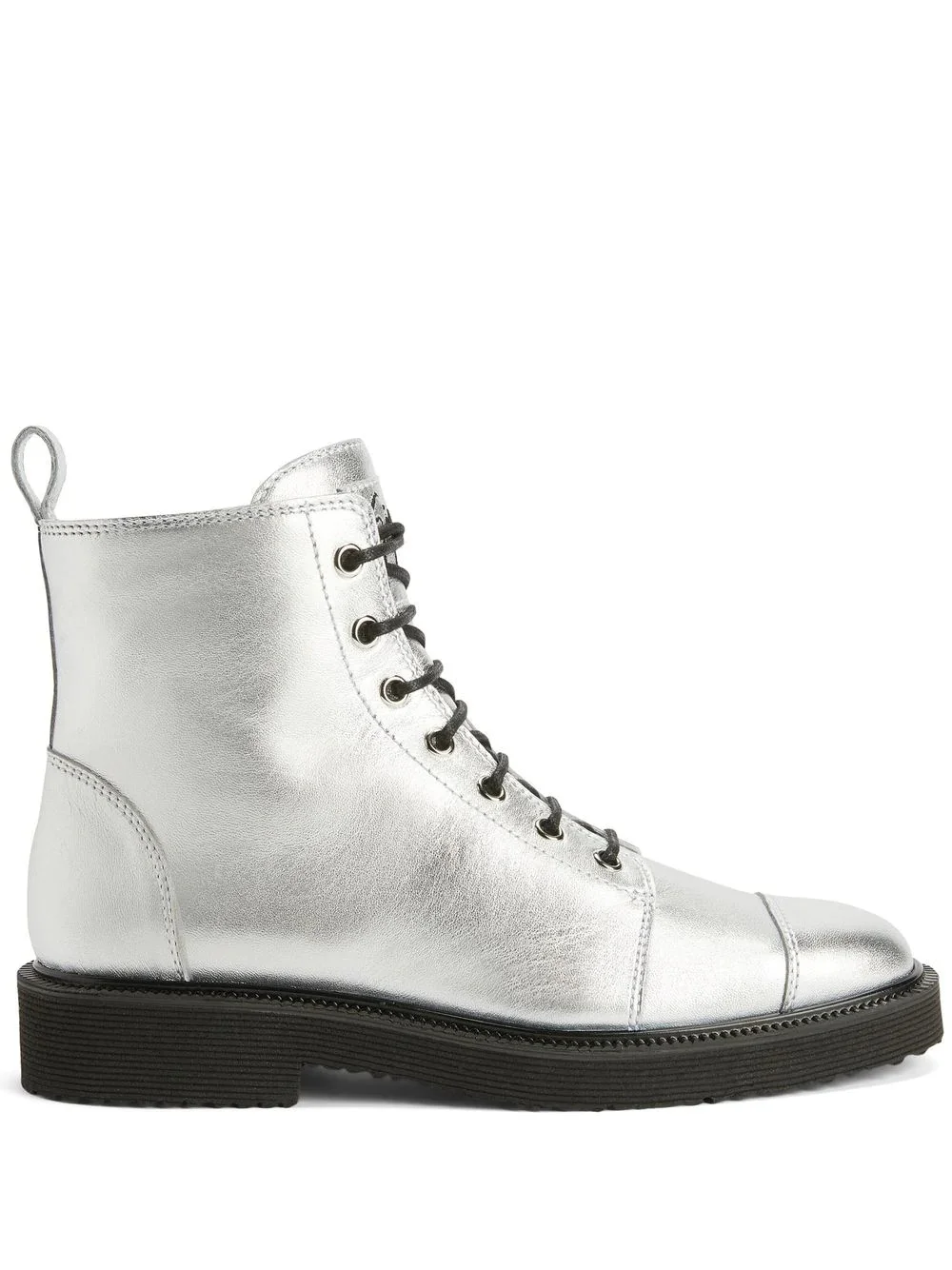 Thora lace-up cargo boots silver/black leather round toe front lace-up fastening logo patch at the tongue side zip fastening ankle-length pull-tab at the heel flat rubber sole Made in Italy Composition Lining: Sheepskin 100%, Artificial Fur 100% Outer: Leather 100% Sole: Rubber 100%