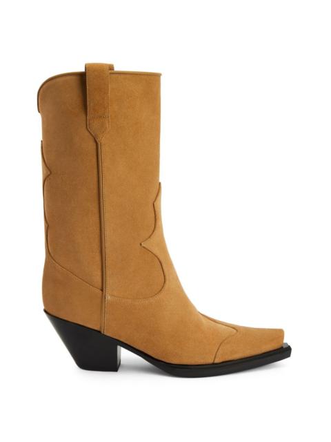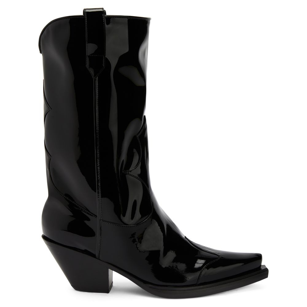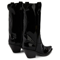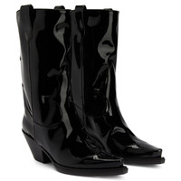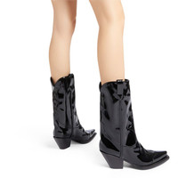Product Details Cowboy boots crafted from black synthetic fabric with a patent leather effect, featuring matching details all along the upper, side pull tabs to ease the fit and black leather soles. Black synthetic fabric with a patent effect (34% PL; 66% PU) with matching details Black leather 55 mm heel Black leather sole with logo Made in Italy