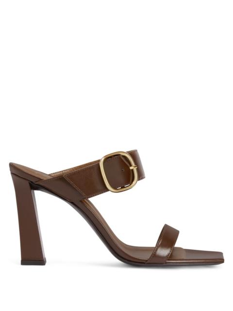 Product Details Open-toe mule sandals in leather with crystal jewel band and block heel. - Black leather - Silver-coloured metal accessory and crystal-coloured rhinestones - 105mm-high heel - Brown leather sole with logo ORIGIN: ITALY COLOR: BLACK