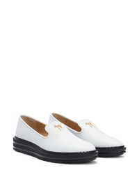 logo-plaque leather loafers Highlights - White/black - Leather - Gold-tone logo plaque - Slip-on style - Round toe - Branded insole - Flat rubber sole Made in Italy Composition Leather 100%
