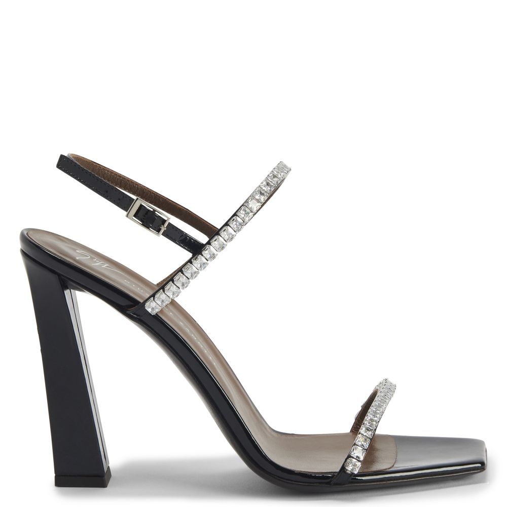 Product Details Patent leather sandals with rhinestone chain applique and block heel. - Black patent leather - Strap with adjustable silver-coloured metal buckle - Silver-coloured metal chain detail and crystal-coloured rhinestones - Heel height: 105 mm. - Black patent leather-covered heel - Brown leather sole with logo ORIGIN: ITALY COLOR: BLACK