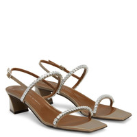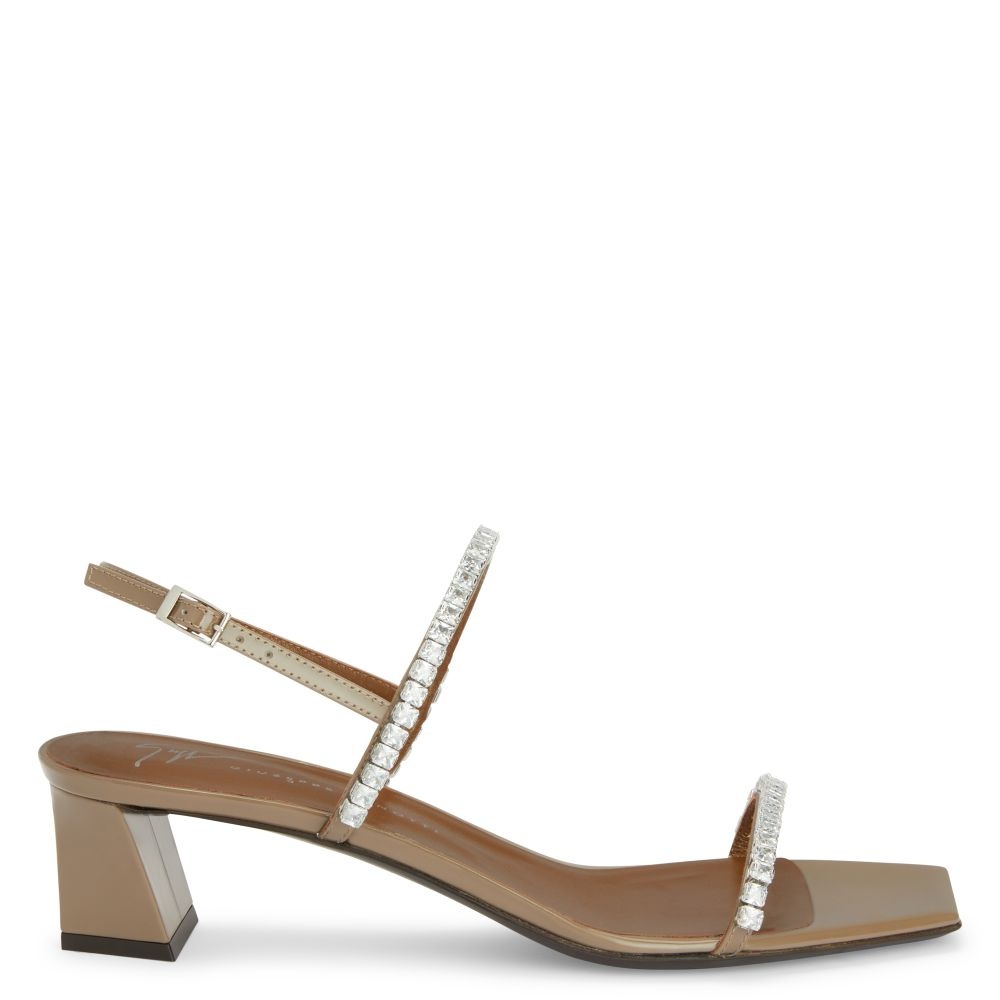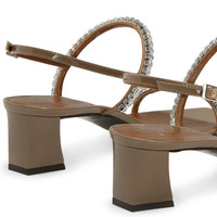 Product Details Patent leather sandals with rhinestone chain applique and block heel. - Taupe-coloured patent leather - Strap with adjustable silver-coloured metal buckle - Silver-coloured metal chain detail and crystal-coloured rhinestones - Heel height: 45 mm. - Taupe patent leather-covered heel - Brown leather sole with logo ORIGIN: ITALY COLOR: GREY