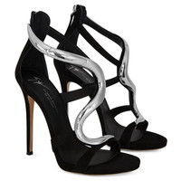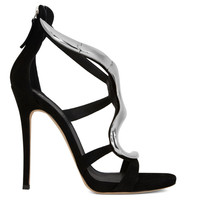 Product Details Sandals in suede with metal snake accessory and stiletto heel - 120 mm heel - Black suede - Metal 'snake' accessory - Leather sole with logo ORIGIN: ITALY COLOR: BLACK