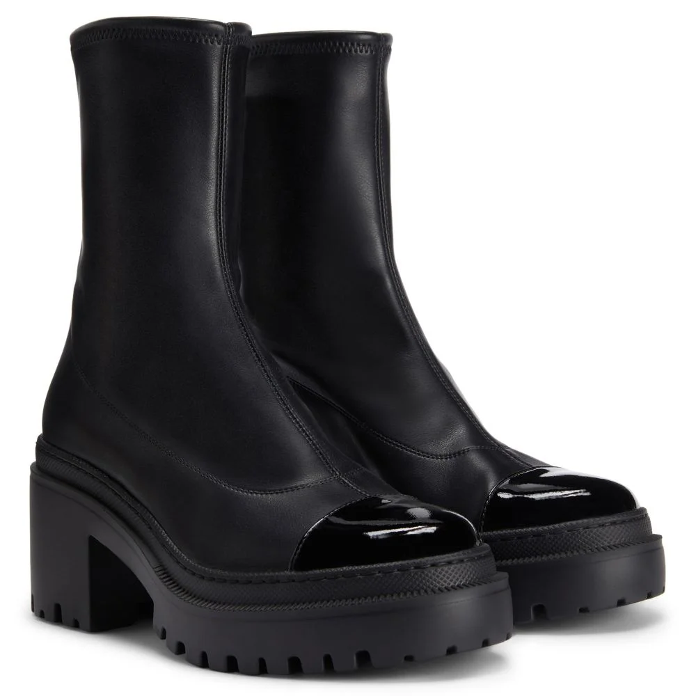 Product Details Leather-effect stretch fabric combat boots with stud detail at the back and one-piece sole. - Black leather-effect synthetic stretch fabric and black patent leather toe cap and details - Gunmetal grey metal stud detail - Heel height: 70 mm - One-piece black rubber sole with logo ORIGIN: ITALY COLOR: BLACK