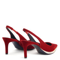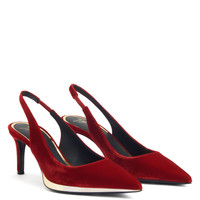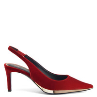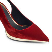 Product Details These pointed-toe slingback pumps crafted from red velvet-effect synthetic fabric feature matching covered stiletto heels and are embellished with a black leather sole outlined by a golden mirrored-effect detail on the outside. Velvet-effect red synthetic fabric 70 mm heel Heel covered in velvet-effect red synthetic fabric Black leather sole with mirrored-effect golden detail Made in Italy