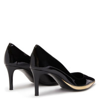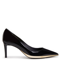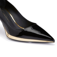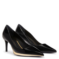 Product Details These pointed-toe pumps with stiletto heels, crafted from black patent-effect synthetic fabric, are embellished with a leather sole outlined by a golden mirror-effect detail on the outside. Black patent-effect fabric upper (34% PL; 66% PU) 70 mm heel Heel covered in black patent-effect synthetic fabric (34% PL; 66% PU) Black leather sole with golden mirror-effect detail on the outside and logo Made in Italy