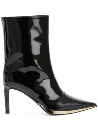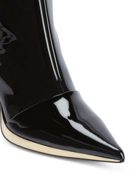 Product Details These pointed-toe ankle boots are crafted from black patent-effect synthetic fabric, feature matching covered stiletto heels and are embellished with a black leather sole outlined by a golden mirrored-effect detail on the outside. Patent-effect black synthetic fabric 85 mm heel Heel covered in patent-effect black synthetic fabric Black leather sole with mirrored-effect golden detail Made in Italy