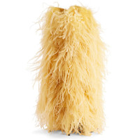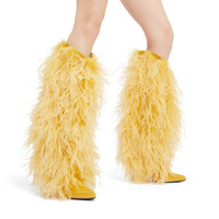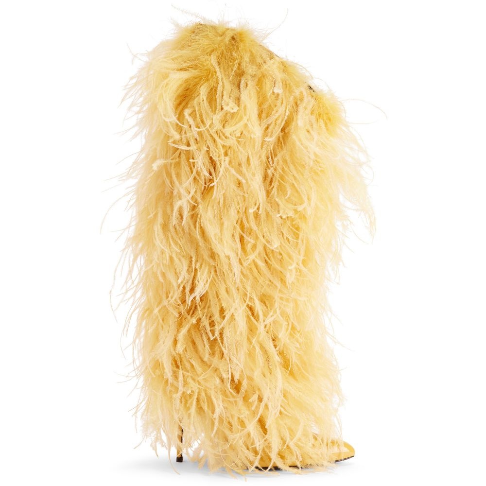 Product Details These pointed-toe boots are crafted from yellow patent leather and feature matching satin leg shafts covered in yellow ostrich feathers, matching covered stiletto heels and a black leather sole. Yellow patent leather with synthetic satin leg shaft and yellow ostrich feathers 105 mm heel Heel covered in yellow patent leather Black leather sole with logo Made in Italy